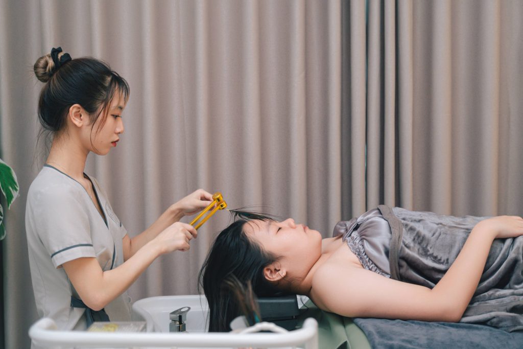 | Bước 11 | Sử dụng tinh chất chống rụng tóc và ngứa da đầu | Lau khô tóc, ấn huyệt vai gáy |